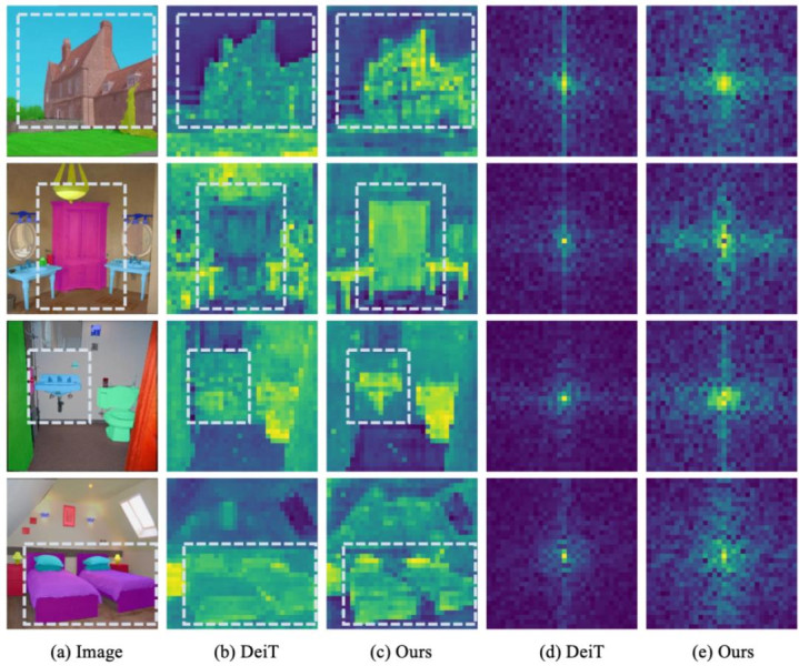 “一图胜千言”。从下方的特征图对比中可以直观地看到,标准 DeiT 的特征图(b)细节模糊,而经过 FDAM 增强后的特征图(c)轮廓清晰、纹理锐利,物体的结构被完美地保留了下来。其对应的频谱图(e)也证实了我们的方法保留了更丰富的高频成分。
