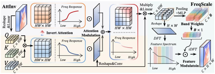 FreqScale 就像一个多频段图形均衡器。它将特征图转换到频域,将其划分为多个频段,并为每个频段学习一个动态的增益权重。这样,模型不仅能区分高低频,还能根据需要精确地 “增强” 或 “抑制” 某个特定频段的信号,例如,为分割任务特别增强中高频的边缘信号。