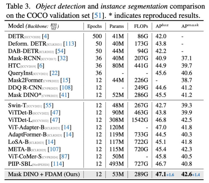 我们的 FDAM 模块是 “即插即用” 的,可以轻松集成到各种主流 ViT 架构中,且带来的参数量和计算量开销微乎其微。但效果的提升却是实实在在的: