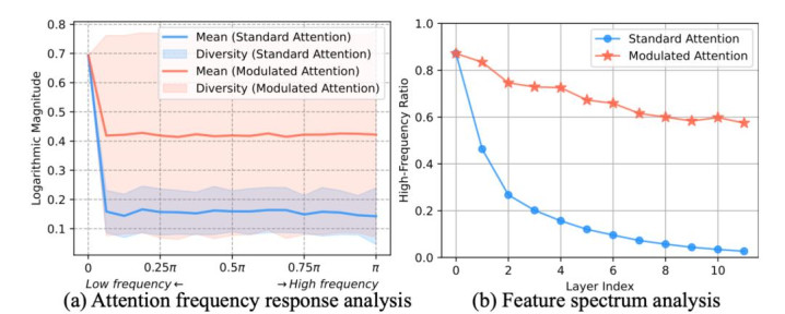 此前,一些工作尝试缓解 ViT 的 “过平滑” 问题,例如通过正则化或直接在频域上对衰减的高频信号进行静态补偿(如 AttnScale, NeuTRENO 等)。这些方法起到了一定作用,但它们更像是 “亡羊补牢”—— 在细节丢失后进行被动修复,而未能从根本上改变注意力机制的低通天性。它们缺乏一种动态、自适应的能力,来根据不同图像内容和任务需求,灵活地处理全频谱的视觉信息。