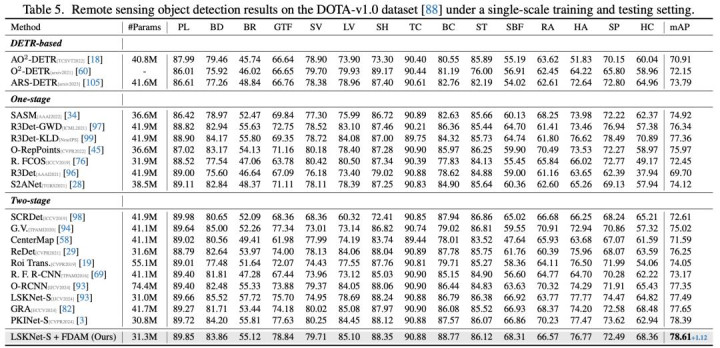 在遥感图像检测 DOTA 数据集上,我们的方法同样取得了当前单尺度设定的最优成绩。